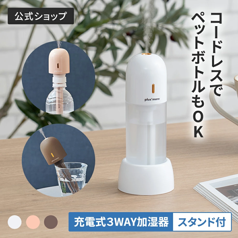 大感謝祭期間クーポン配布&ポイント2倍!【なるほどプレゼンター!花咲かタイムズ で紹介されました!】携帯加湿器 ペットボトル 加湿器 ポータブル加湿器 充電式 3WAY スタンド付き PBAHF006 plusmore 小型 静音 卓上 携帯用 コンパクト 軽量 グラス対応 タンク付き USB充電式価格:2178円