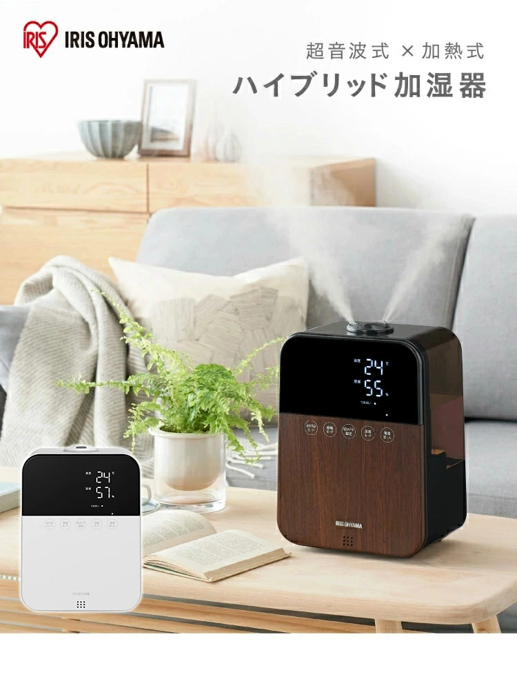 アイリスオーヤマのハイブリッド加湿器は、レビュー数が非常に多い人気モデルで、自動湿度調整機能により管理がラク、静音で寝室にも対応できます。